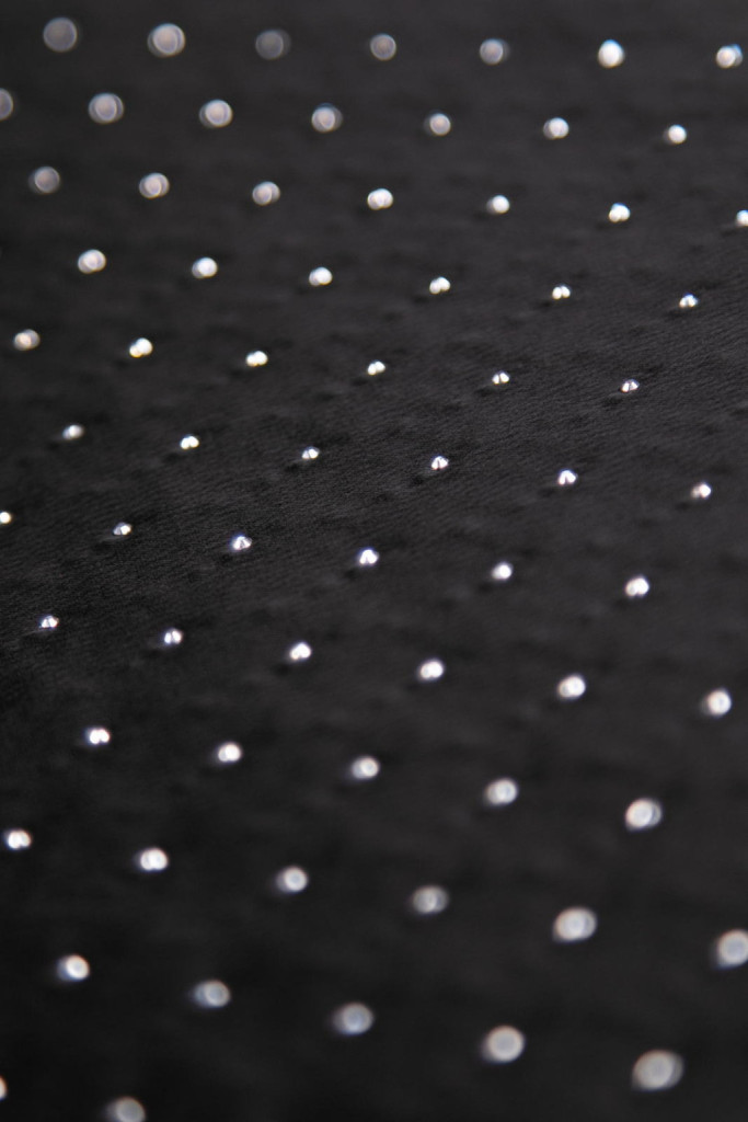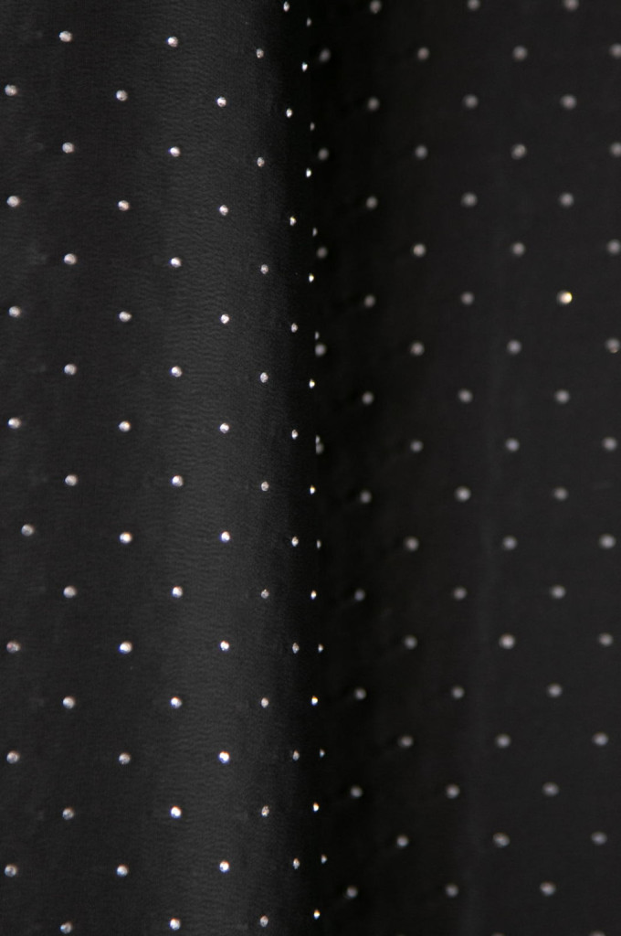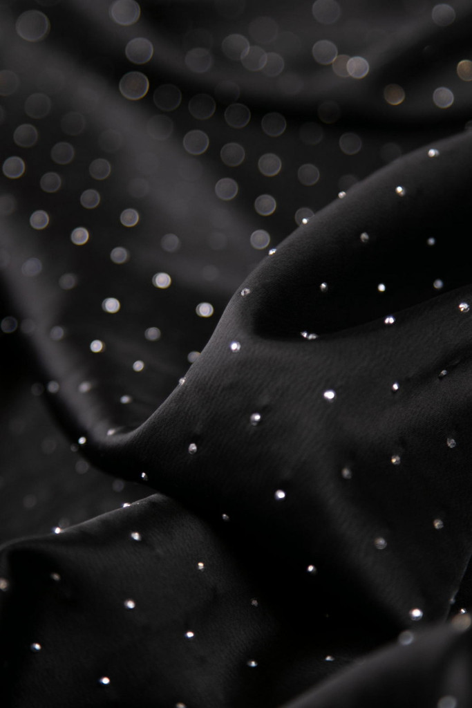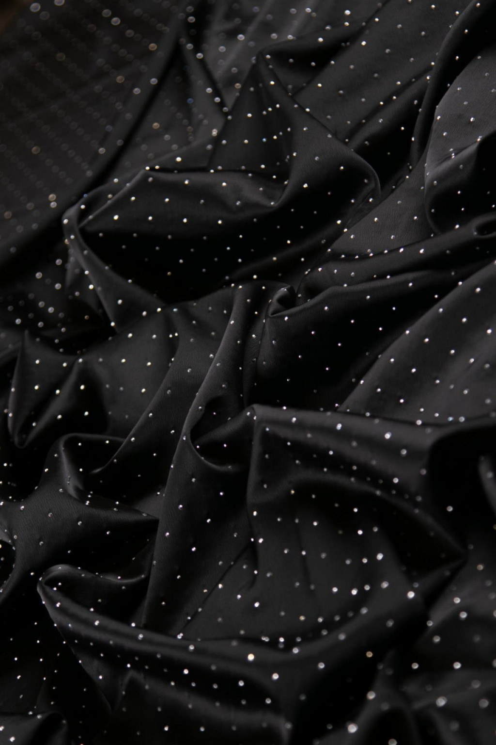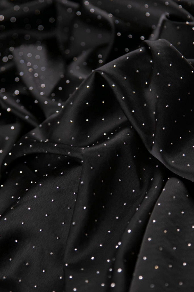 Kristállyal díszített polyester selyem, szaténos felülettel. Tökéletes választás, ha valamilyen elegáns ruhadarabot szeretnénk. Ettől a selymesen csillogó, puha és kellemes tapintású szövettől mindent megkapunk, ami ehhez az érzéshez és megjelenéshez kell. Az apró kristályok teszik igazán tündöklővé.