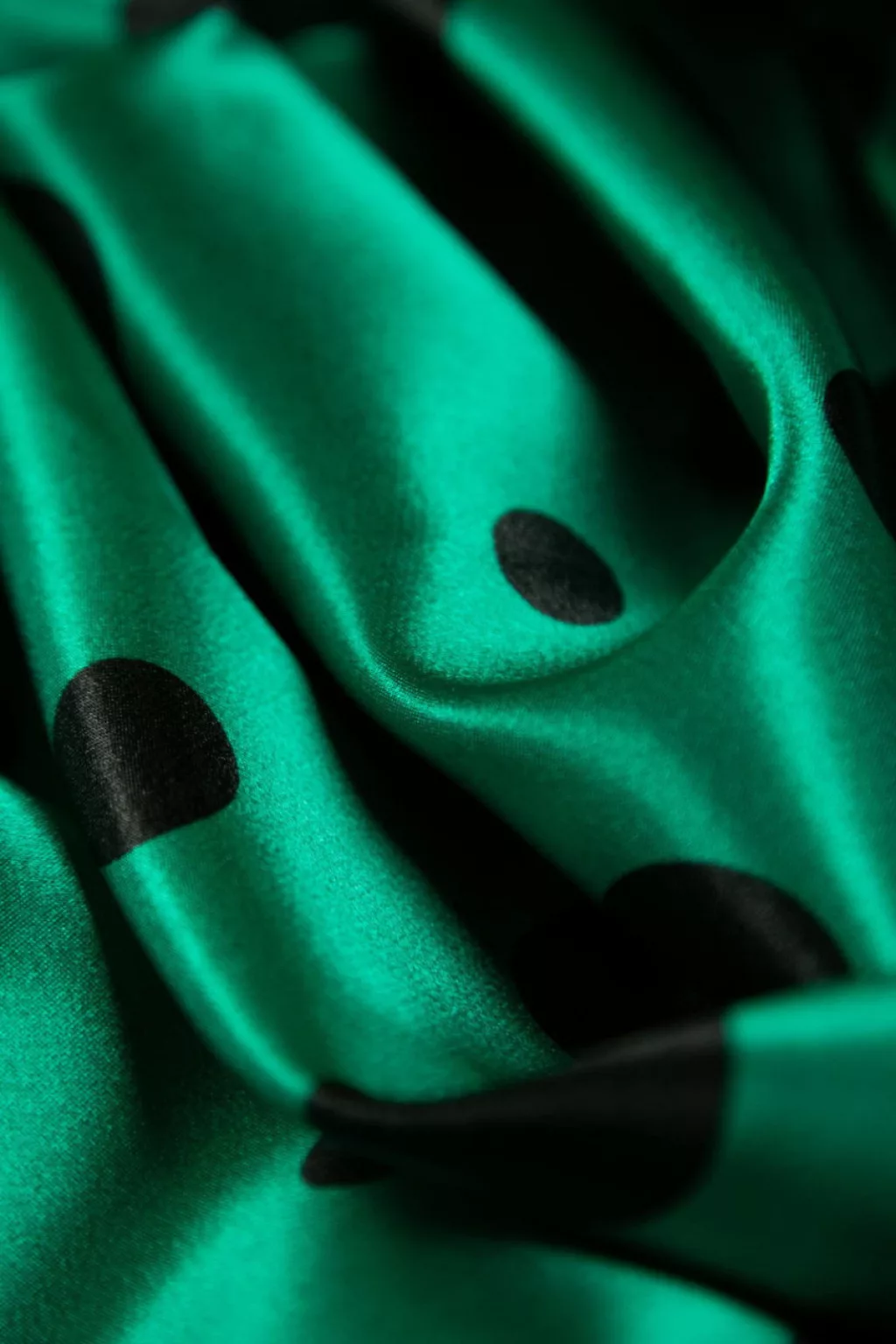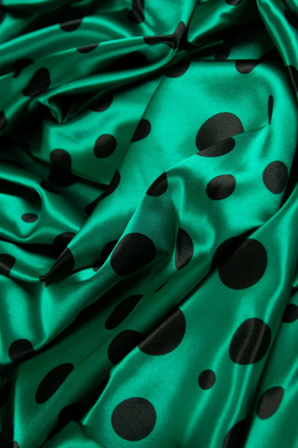 A pöttyös szatén egy lágy esésű, selymes fényű és rugalmas textil, amely eleganciát és vidámságot egyaránt képes sugározni. Finom tapintása, fényes felülete és kellemes rugalmassága különösen kényelmes viseletet biztosít.