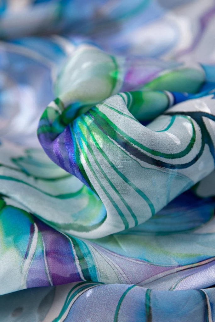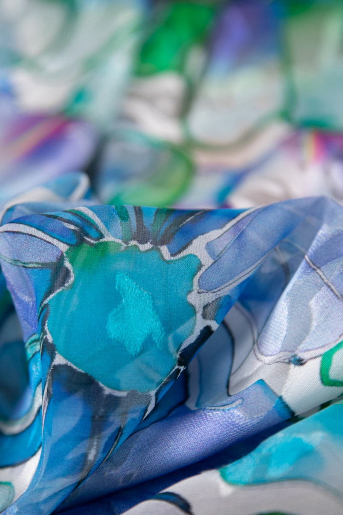 Exkluzív selyem/viszkóz devoré anyag finoman áttetsző mintázattal. Légies, selymes tapintású textil, amely különleges fényével és egyedi textúrájával kifinomult, nőies megjelenést kölcsönöz.